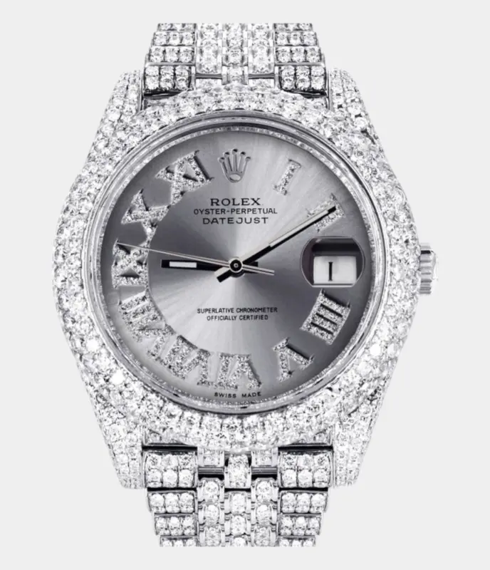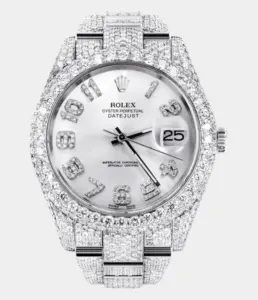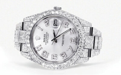 500,00 $ – 1.600,00 $Diamond Iced Out Rolex Datejust 41 | 25 Carats Of Diamonds | Custom Silver Diamond Dial | Two Row | Oyster Band Replik