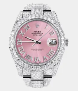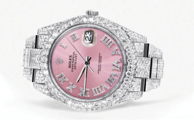 500,00 $ – 1.600,00 $Diamond Iced Out Rolex Datejust 41 | 25 Carats Of Diamonds | Custom Pink Roman Numeral Diamond Dial | Two Row | Oyster Band Replik