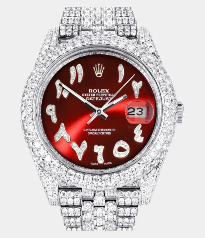 Diamond Iced Out Rolex Datejust 41 | 25 Carats Of Diamonds | Custom Red Arabic Numeral Diamond Dial | Two Row | Jubilee Band Replik