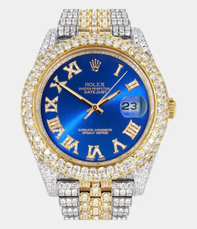 500,00 $ – 1.600,00 $Diamond Iced Out Rolex Datejust 41 | 25 Carats Of Diamonds | Custom Blue Roman Numeral Diamond Dial | Two Tone | Two Row | Jubilee Band Replik