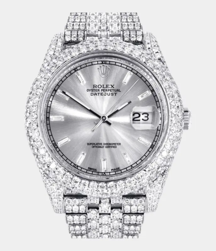 Diamond Iced Out Rolex Datejust 41 | 25 Carats Of Diamonds | Custom Silver Diamond Dial | Two Row | Jubilee Band Replik