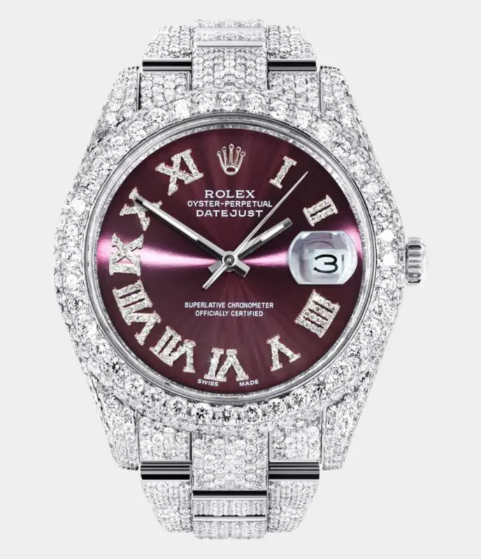 Diamond Iced Out Rolex Datejust 41 | 25 Carats Of Diamonds | Purple Roman Numeral Dial | Two Row | Oyster Band Replik