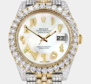 500,00 $ – 1.600,00 $Diamond Iced Out Rolex Datejust 41 | 25 Carats Of Diamonds | Custom Mother of Pearl Arabic Numeral Diamond Dial | Two Tone | Jubilee BandReplik