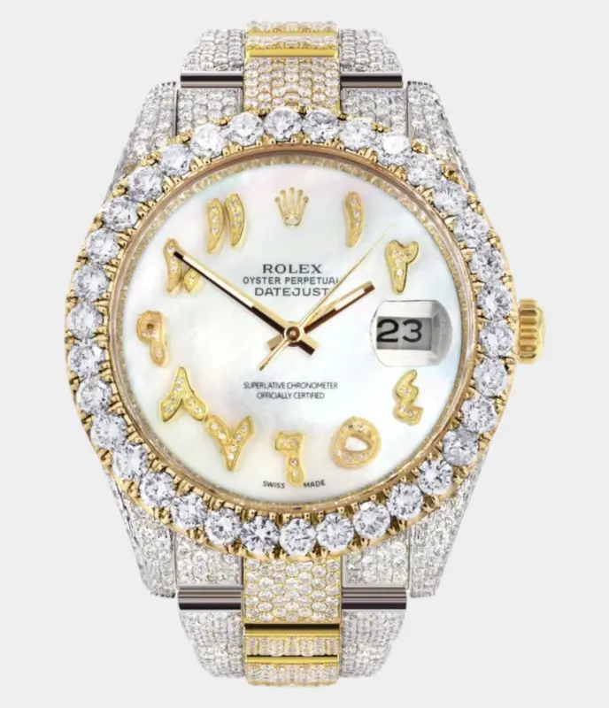Diamond Iced Out Rolex Datejust 41 | 25 Carats Of Diamonds | Custom Mother of Pearl Arabic Numeral Diamond Dial | Two Tone | Oyster Band Replik