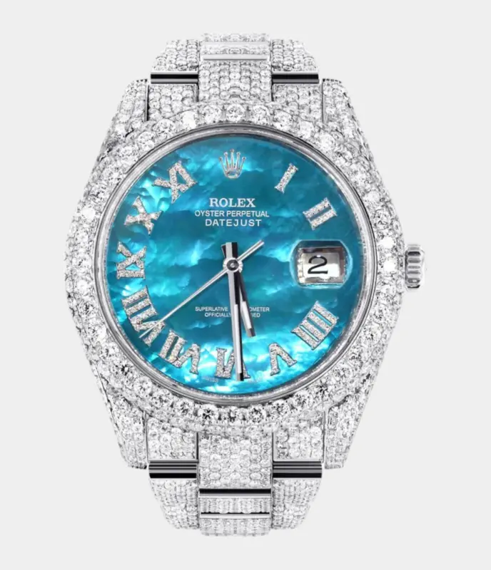 Diamond Iced Out Rolex Datejust 41 | 25 Carats Of Diamonds | Aquamarine Mother of Pearl Dial | Two Row | Oyster Band Replik