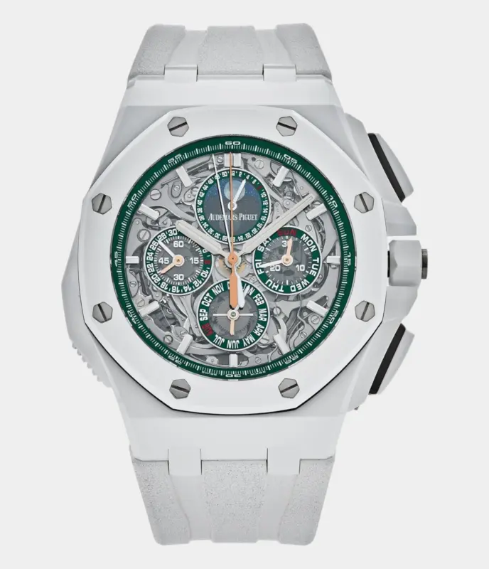 Diese Royal Oak Offshore Grande Complication Replik ist ein außergewöhnliches Einzelstück mit ewigem Kalender, Chronograph und Minutenrepetition – ein Meisterwerk der Haute Horlogerie, das extreme Komplexität mit maskuliner Präsenz verbindet.